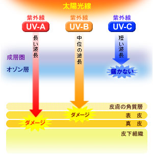 紫外線のことを簡単にお話しますと、波長の長い順にA波(UVA)・B波(UVB)・C波(UVC)に分けられ、地球を取り巻くオゾン層に阻まれて地上に届くのは、A波(UVA)とB波(UVB)の2種類の紫外線と言われています。