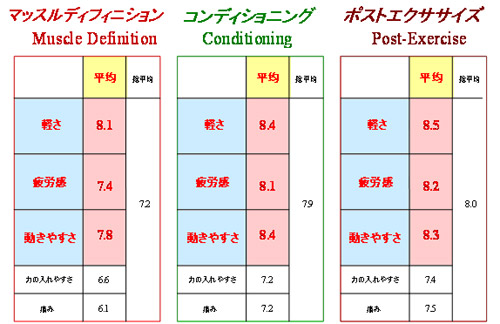 2005年2月から8月までの6ヶ月間、モニター対象者75名(男性26名、女性50名)のプロゴルフ、プロテニス、プロ野球、実業団陸上競技などのスポーツ選手を対象に、エンダモロジーのフィットネスプログラム(マッスルディフィニション、コンディショニング、ポストエクササイズ)を行いました。