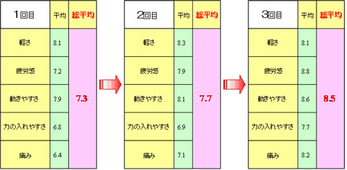 皆さんも感じたことがある『からだのだるさ、重い、違和感など』ケガ以外の症状に対してエンダモロジーを行い、トリートメントの前後で柔軟性をチェックしました。 さらに、トリートメント直後の変化を「軽さ」「疲労感」「動かしやすさ」「力の入れやすさ」「痛み」の5項目について選手に話を聞き、11段階で評価し、症状が悪化した場合を0、症状に何も変化がない場合を5、症状が改善された場合を10として、その評価を表に表しました。