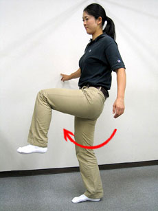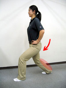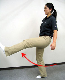 3つ目の『運動の適応性を高める』対処法としては、ゴルフの動作の中で使う筋肉や関節を動かして可動範囲を広げ、ゴルフのスイングが行いやすいように、また歩きやすいようにしましょう。例えば歩きやすいように、股関節の運動をダイナミックに行いましょう。今度は動かしてのバリスティックストレッチです。
