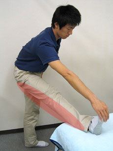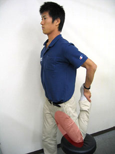 5)膝関節と大腿部前面のストレッチ(椅子を使用)