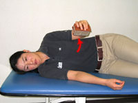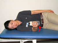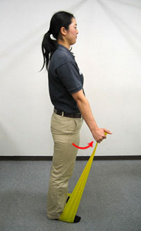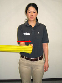 棘下筋と小円筋のトレーニングは、肘を90度に曲げてからだに固定し、右肩の場合は右の方向へ少し移動させましょう。(からだから離れる感じです)