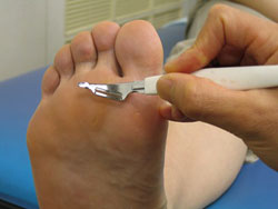 角質層が厚いと接触する部位の圧力が強くなり、タコや魚の目ができやすくなるので、角質層の厚い部分は専用のヤスリなどで削る。 |